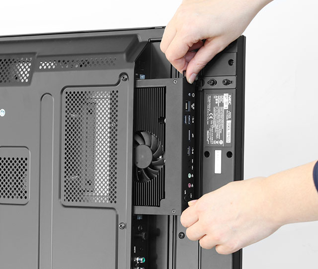 - Prostorově úsporná instalace vstupních zdrojů displejů, jako je např. informačně založené programování, compute modules Raspberry Pi nebo přehrávání médií na bázi systému Android