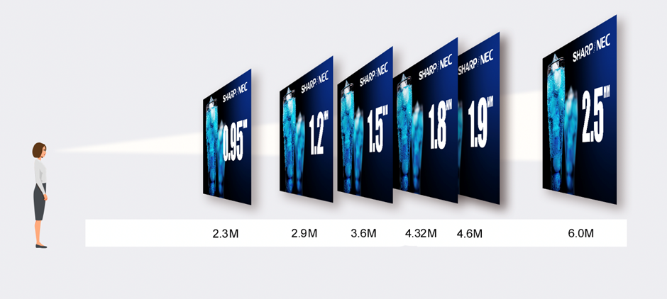 When matching the perfect fit solution to the viewing distance of your application, its not only the size of the display that matters – what is even more crucial is the size of the pixel pitch. The nearer you are to the display the finer the pixel pitch needed. The rule of thumb is 1mm pixel pitch for every 8-foot viewing distance. So, an LED display in a meeting room scenario will need a finer pixel pitch compared to a display used for signage where passers-by are more distant. Furthermore, the greater the number of meeting participants, or potential passers-by, the larger the display size needed.