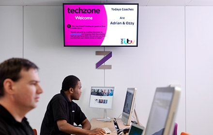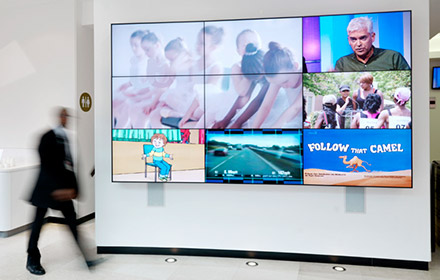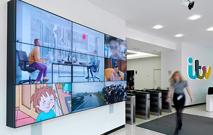 Upgrading ITV’s technology infrastucture goes beyond the desktop to encompass digital signage in order to improve communication in public access areas and aid collaboration in meeting rooms and break out areas. The reception at ITV’s South Bank office utilises NEC’s 46inch X463UN ultra narrow bezel videowall display in a 3x3 configuration to create an striking first impression for visitors. The videowall displays ident branding footage for each of ITV’s channels and show reels from The London Studios with glimpses of current and past ITV shows to inform and entertain both staff and visitors to ITV.