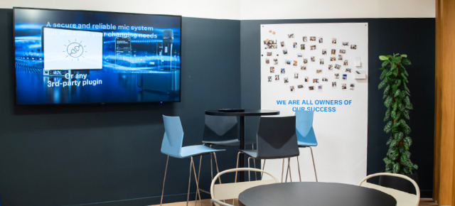 Neben vorhandenem Equipment mussten natürlich auch neu angeschaffte Geräte in die Infrastruktur am neuen Standort eingebunden werden. So sorgen im Lounge-Bereich ein 75-Zoll-Display der NEC MultiSync® C-Serie, ein Digital Signage Player von BrightSign sowie Lautsprecher und Steuerung von Q-SYS für das Entertainment der Besucher. Auch die Mitarbeiterinnen und Mitarbeiter können das Setup nutzen, um beispielsweise in der Pause bei einem Stream zu entspannen oder über Barco ClickShare einem Townhall- Meeting beizuwohnen.