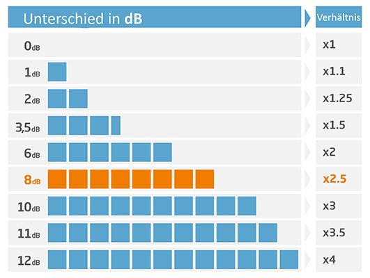 Studien haben ergeben, dass das menschliche Gehör ein um 6 dB lauteres Geräusch doppelt so laut wahrnimmt.