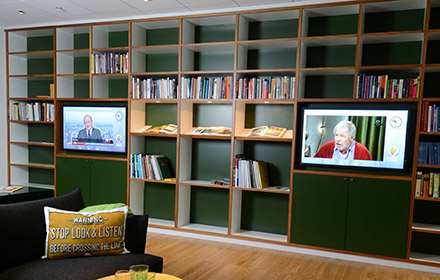The integrated audio visual solution had to be very "exible since the different parts of the premises place different demands on the characteristics of the equipment used. The audio visual devices in public areas would provide visitors with both entertainment and important information, whilst the requested features for the equipment to be used in meeting and conference rooms were of a more practical nature.