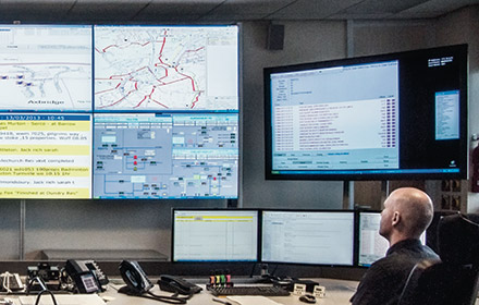 An alarm monitoring system is the single most important display. Permanently connected to the 65-inch display, its content is also available in greater detail on the videowall. It is supported by dual computers that receive data through a SCADA (Supervisory Control And Data Acquisition) system, and monitors all of Bristol Water’s pumps, water levels, flow rates and more.