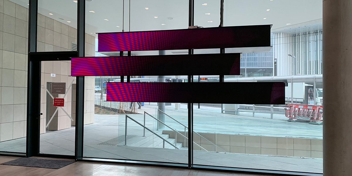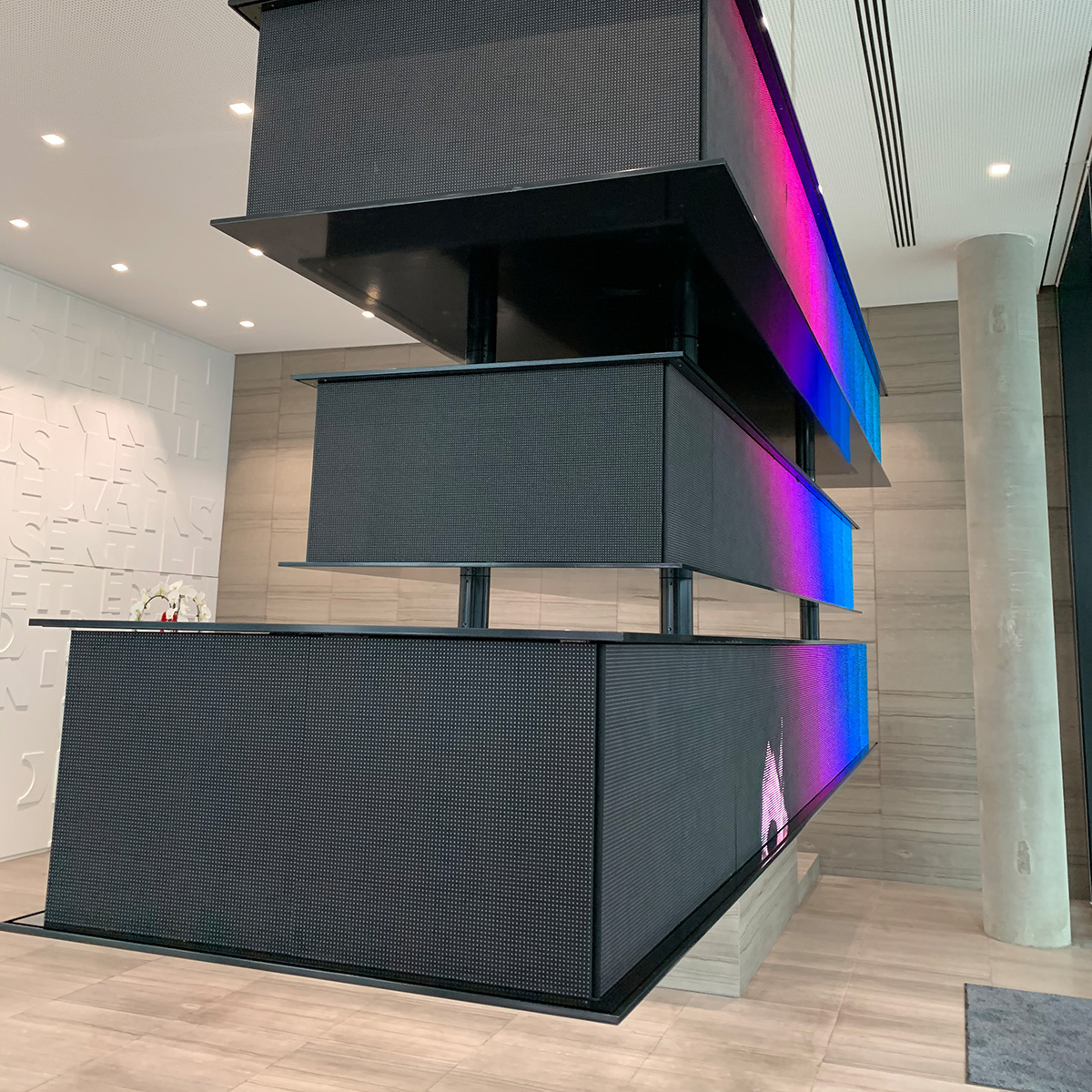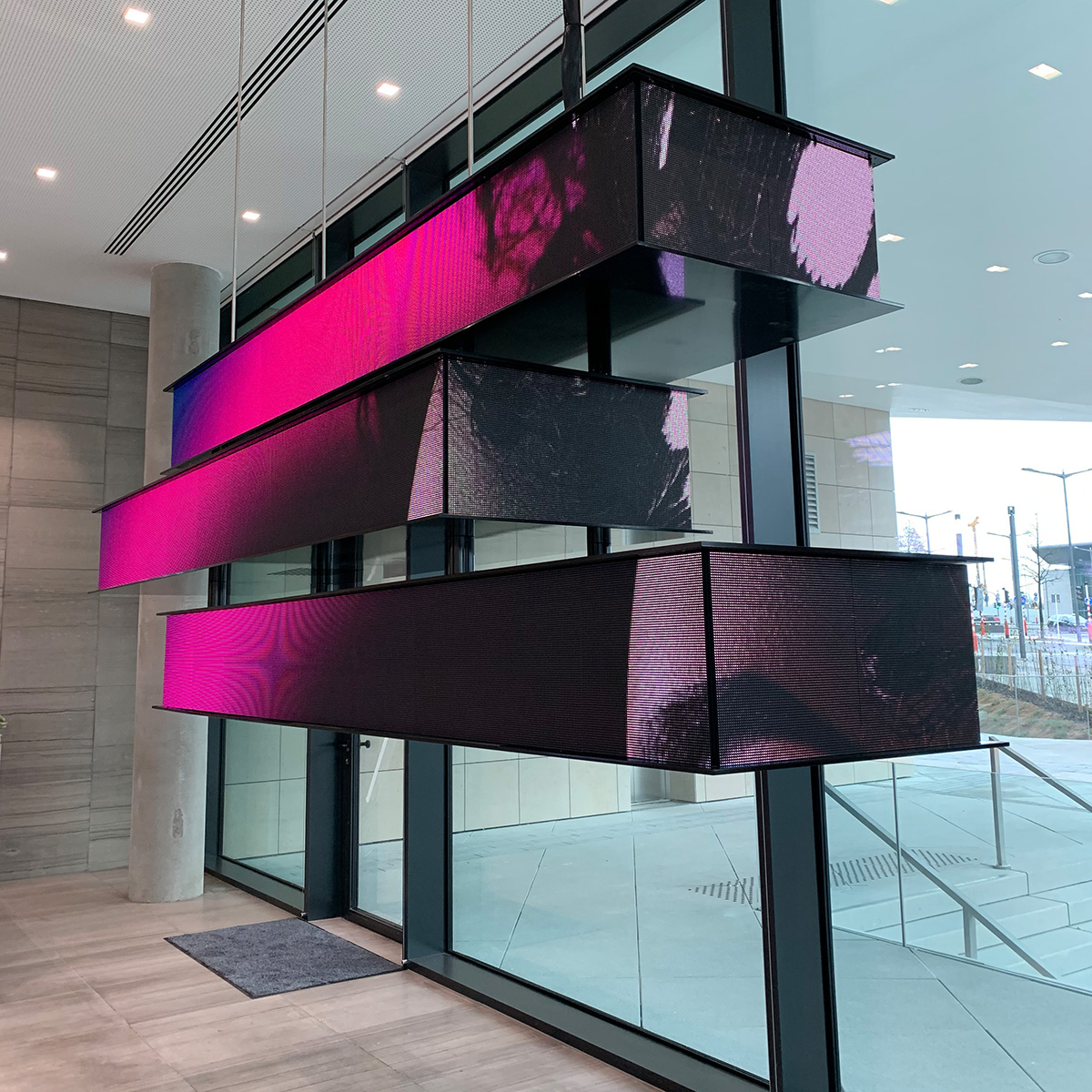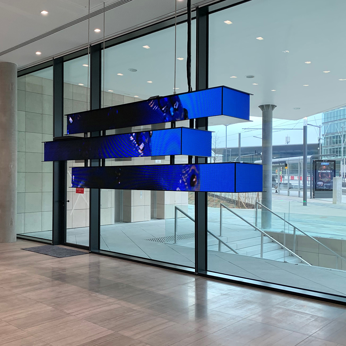 Three LED cuboids form a creative display installation that astonishes. Integrated into a hanging work of art in the lobby of the building, this custom-made display attracts all eyes.