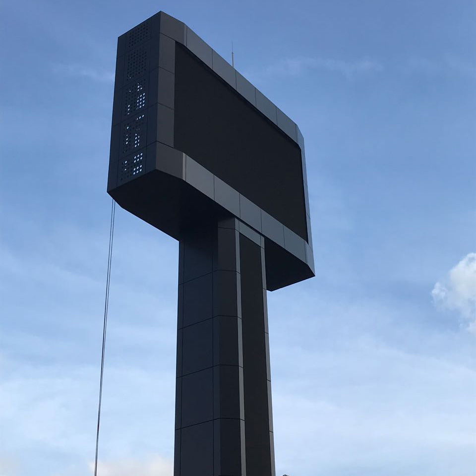 We installed a total of four S[quadrat] SO[10 SMD] NT LED video displays for the circuit at a 15 m high, specially made pylon. The two 21 m² main screens show live broadcasts and advertisement in a 16:9 ratio. Two vertically aligned, 6 m high LED bars at the stand of the pylon will display racing information like positions and the number of laps. The maintenance levels, where the service can be carried out from the backside of the displays, are located inside of the pylon.