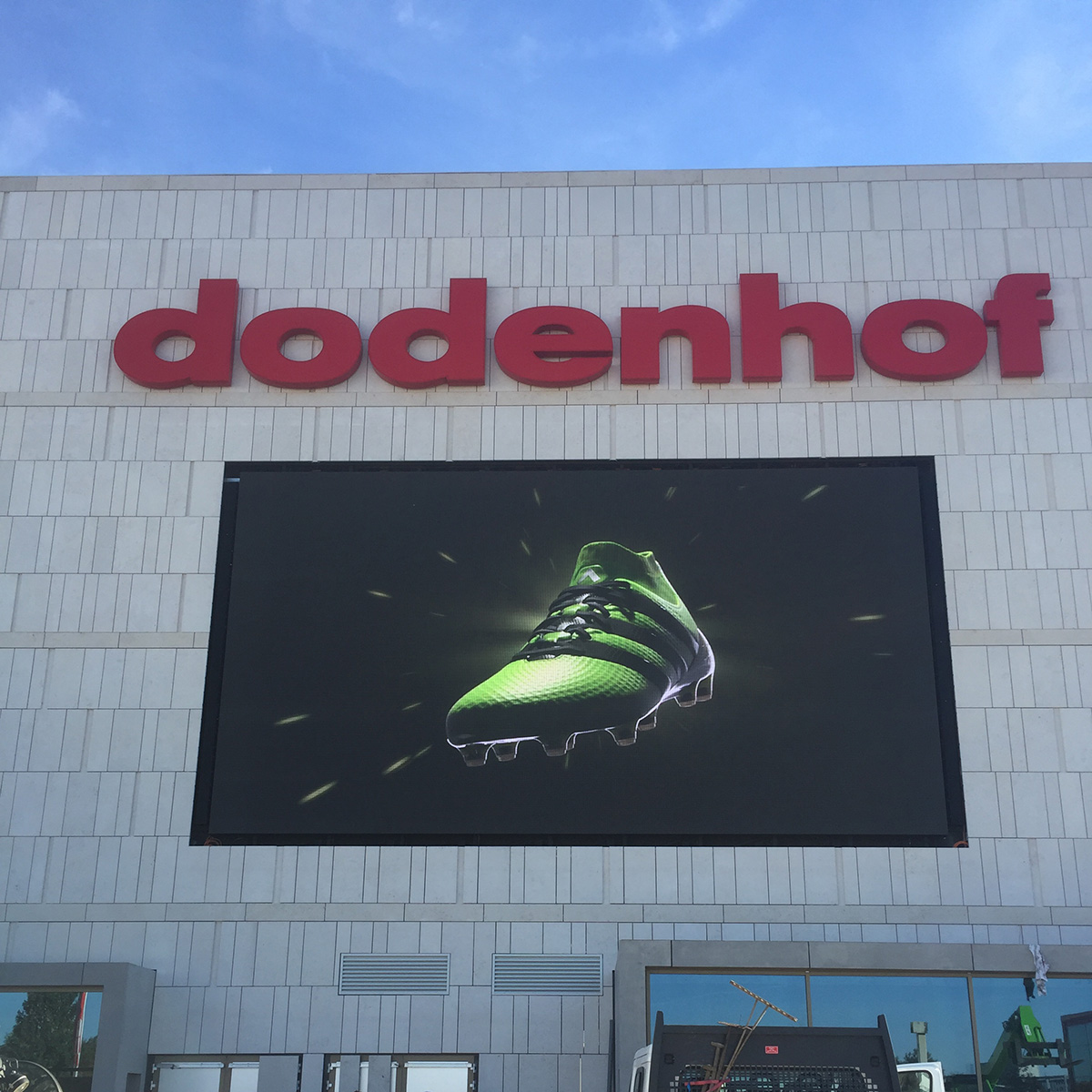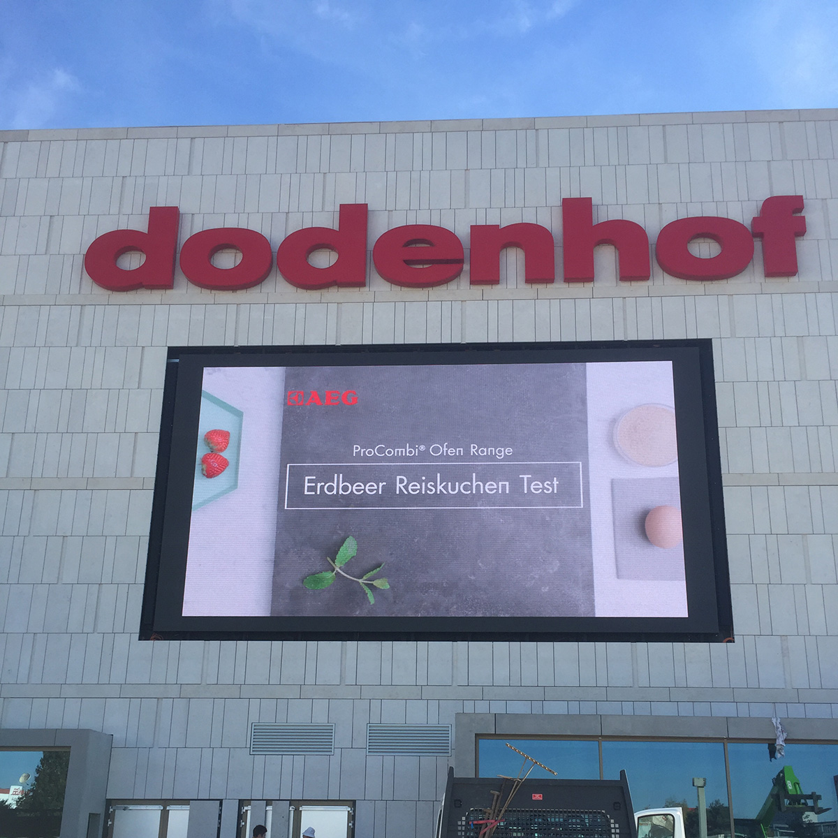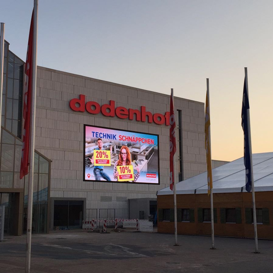 The shopping center dodenhof in Posthausen near Bremen modernizes a building complex and plans the integration of an LED advertising display in the façade. In the future there shall be shown advertising videos and broadcasts of live events. To ensure an optimal performance the LED wall has to reach a sufficient resolution and also withstand changing light conditions as well as direct sunlight. What is more, it is essential for the façade integration that the LED wall can be maintained from the front.