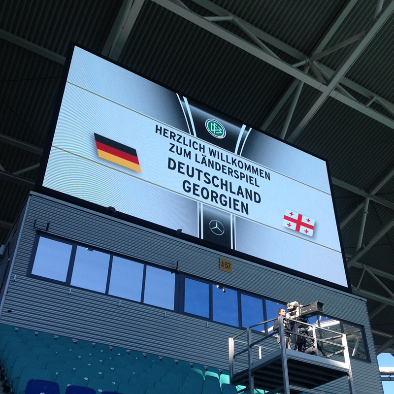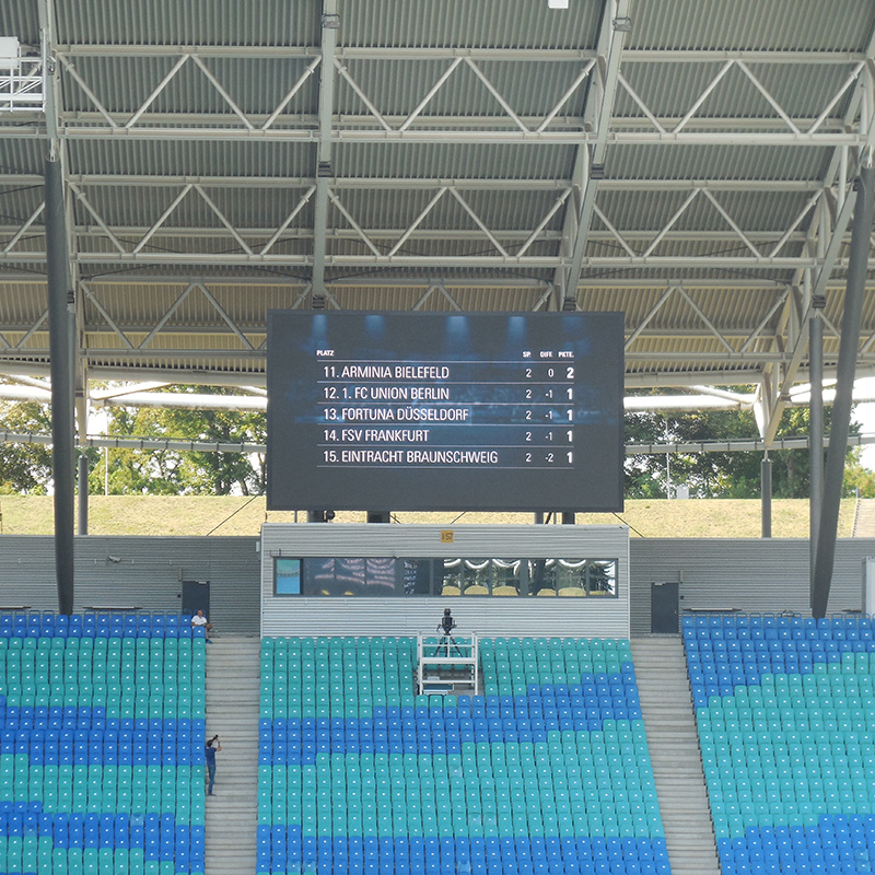The modern football stadium Red Bull Arena in Leipzig desires the exchange of the old display system and its sub-structure. In near future two LED video displays of cutting-edge technology shall provide the high-quality presentation of game information and live broadcasting and also be an attractive advertising platform for sponsors and media partners.