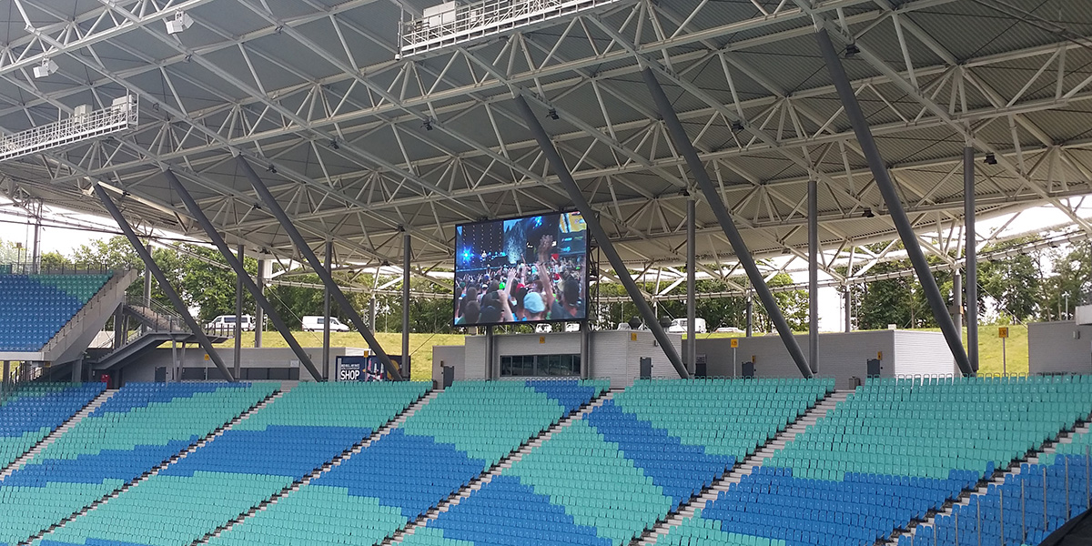 After our assembling team had demounted the old display and the entire sub-structure, the new steel construction was built. To meet the customer’s requirements we installed two 90 m² S[quadrat] SO[10 SMD] NT Light LED video displays. With a pixel pitch of only 10 mm we can achieve a real resolution of 1,280 x 704 pixels per screen, which means an excellent image quality. Both video screens will be played by our content management system SX[ScoreboardTV], individually adjusted for football games. All information will be displayed in real-time during the game. The scoring, line-up, portraits of the players, advertisement of the sponsors and much more can be arranged depending on the customer’s requirements. Our powerful stadium displays persuaded at many games of the “Rote Bullen” and performed brilliantly at the European Championship qualifying match Germany vs. Georgia in 2015.
