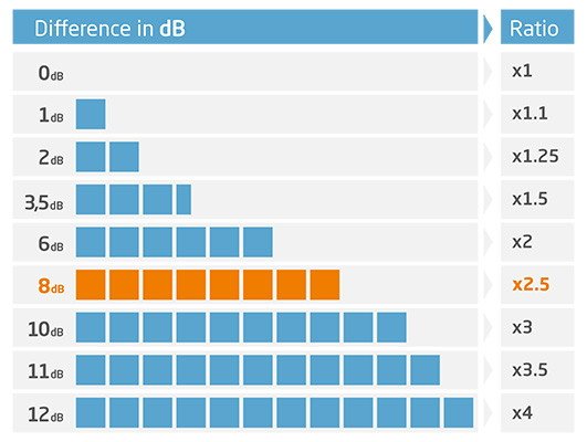 Studies show that a 6dB difference in noise level is perceived as double (x2) the noise level.