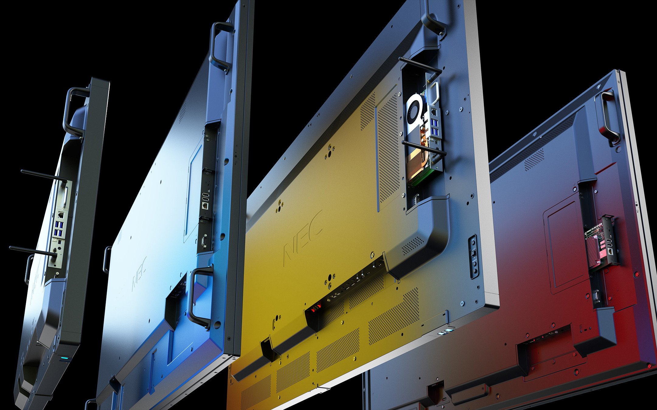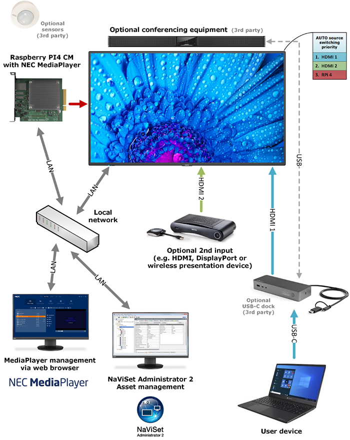 The second (priority 2) video source might be the integrated, and very competitively priced, RaspberryPi compute module with pre-installed, free of charge, NEC MediaPlayer. Neatly slotted into the large format display, there are no additional cables or devices to contend with.